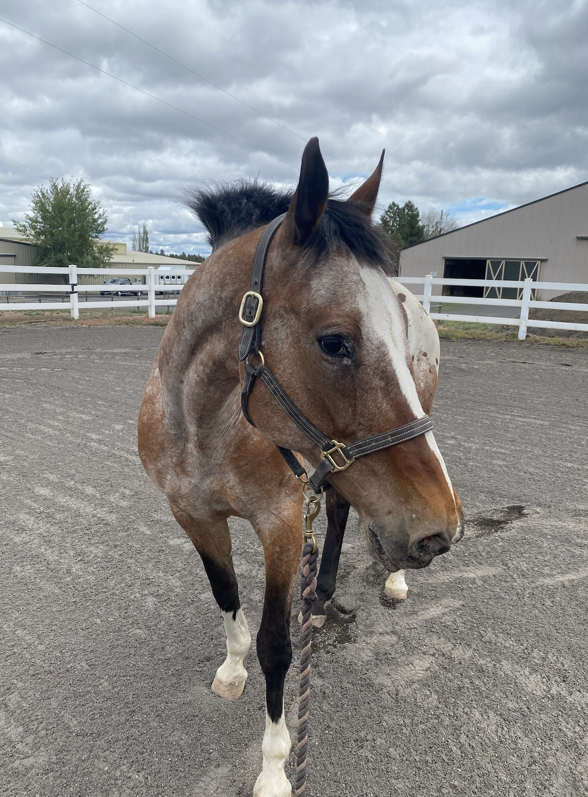 A horse lives in a shared pasture on the property full time with one or two other horses, pending availability and horse relationships.